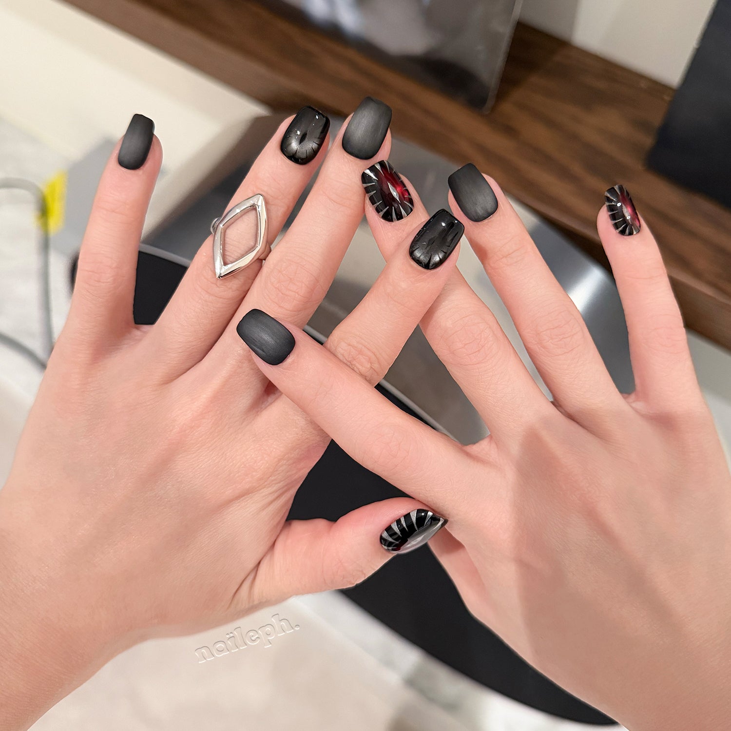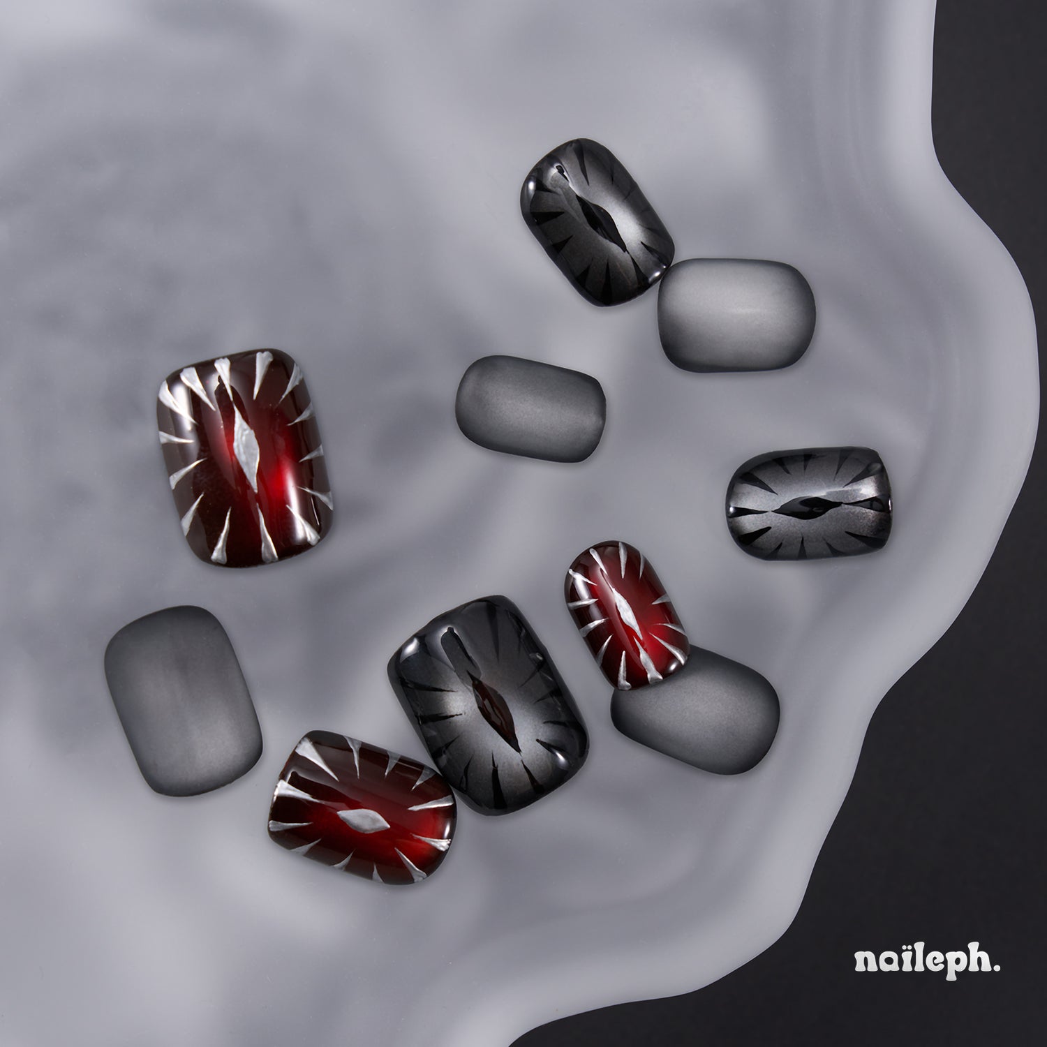 Abyssal Glare is a genderless press-on nail set crafted for anyone who loves bold, dark aesthetics with a sophisticated edge. Featuring a striking mix of deep burgundy red, smoky matte gray, and glossy black, each nail is detailed with sharp silver accents that create a powerful, artistic vibe.