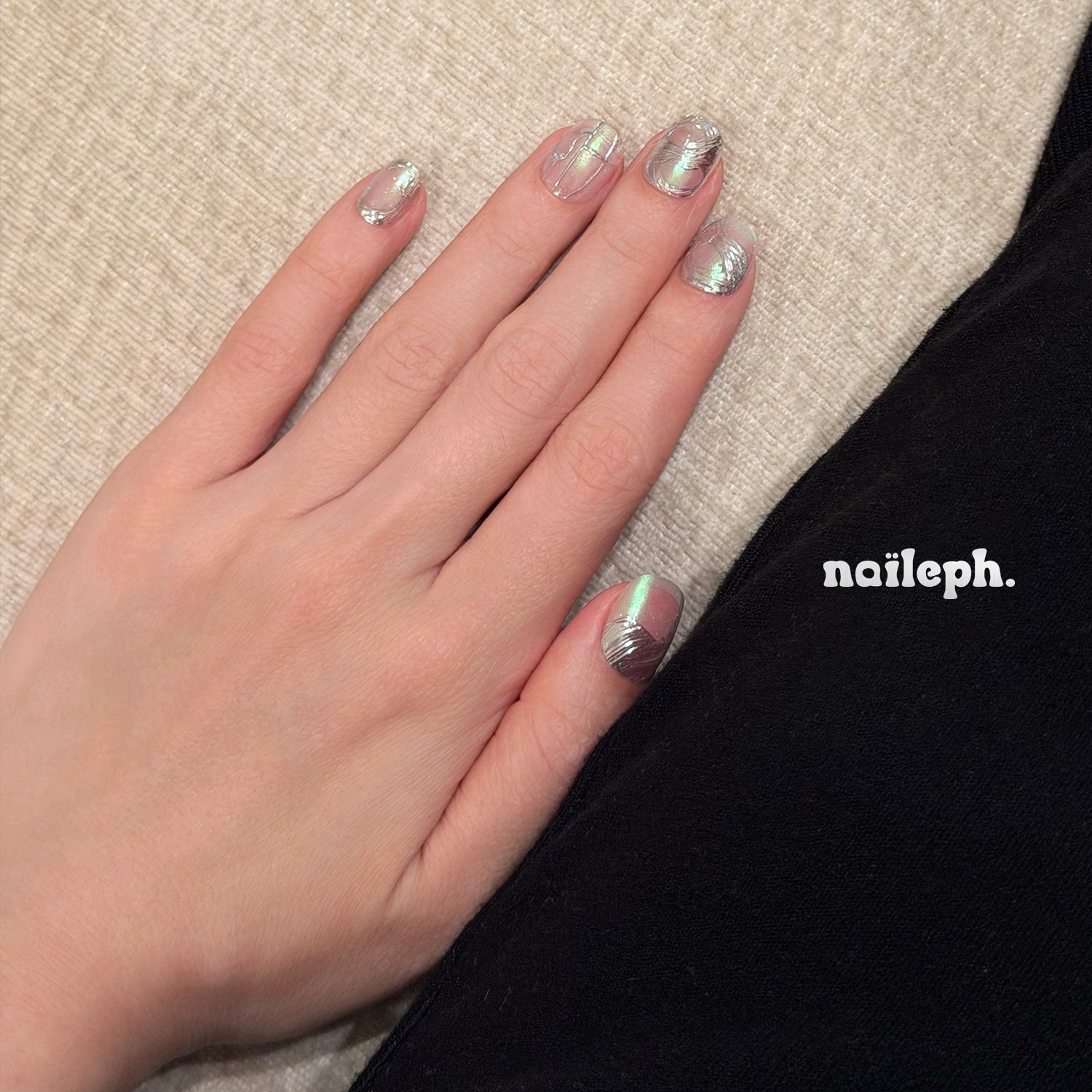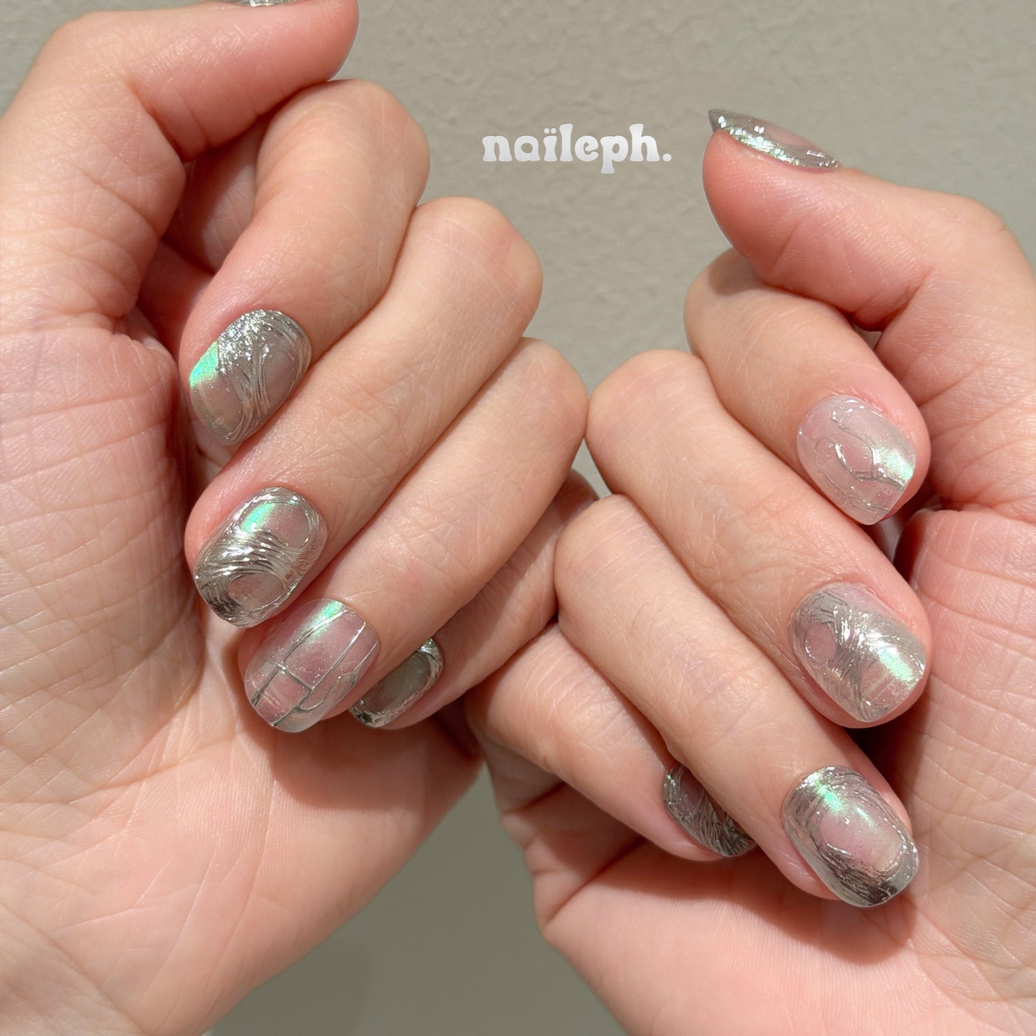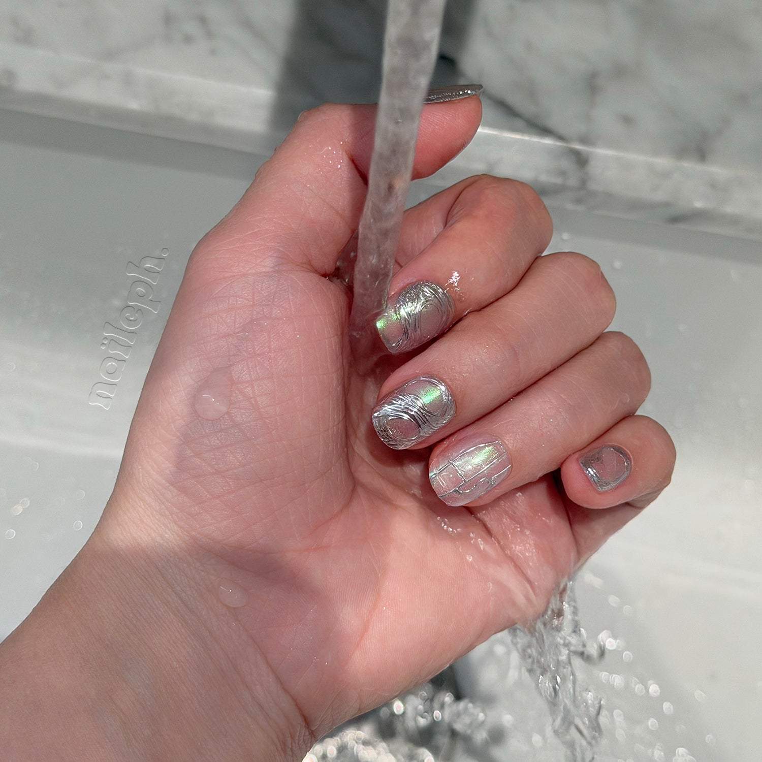 Liquid Alloy is a genderless press-on nail set that looks like it was sculpted from molten metal. With a smooth chrome base and fluid 3D patterns, these nails capture the futuristic vibe of liquid silver fused with hints of emerald green shimmer. The glossy finish makes them sleek, edgy, and unapologetically modern.