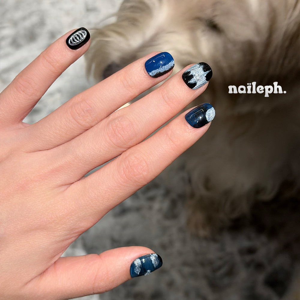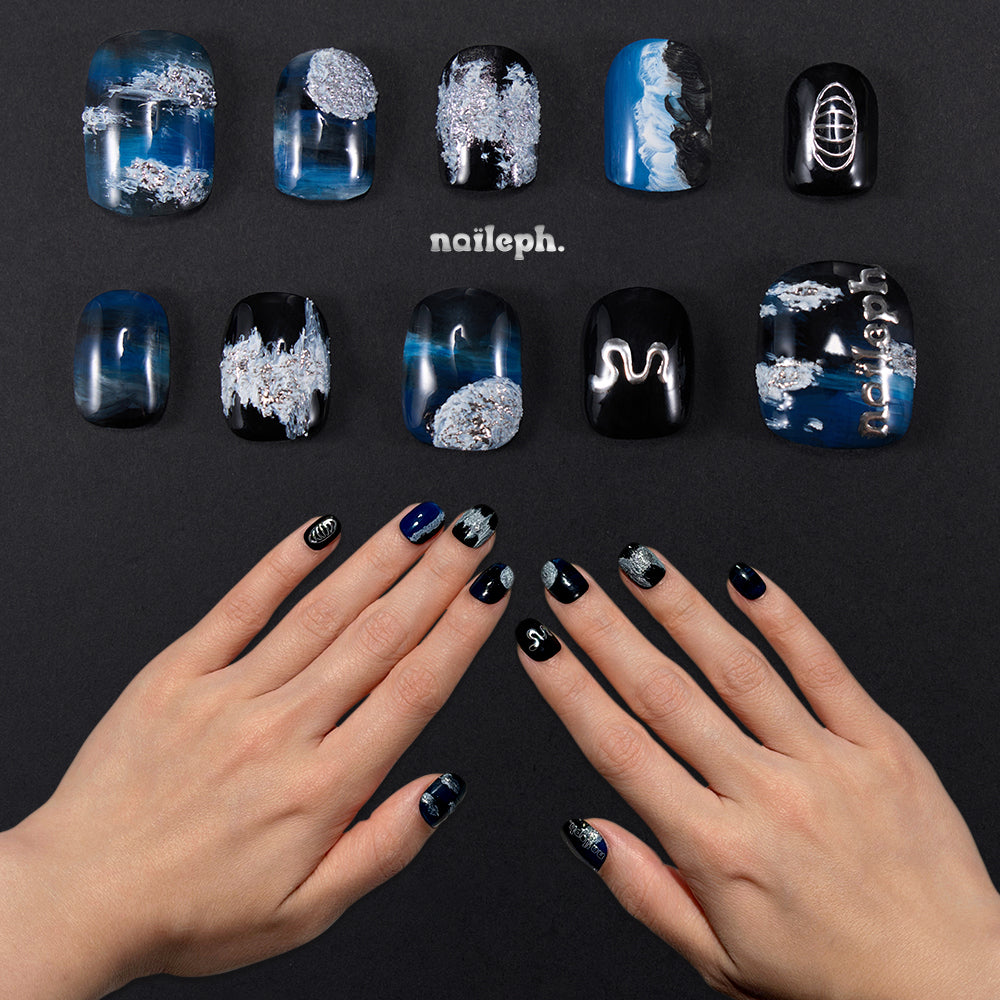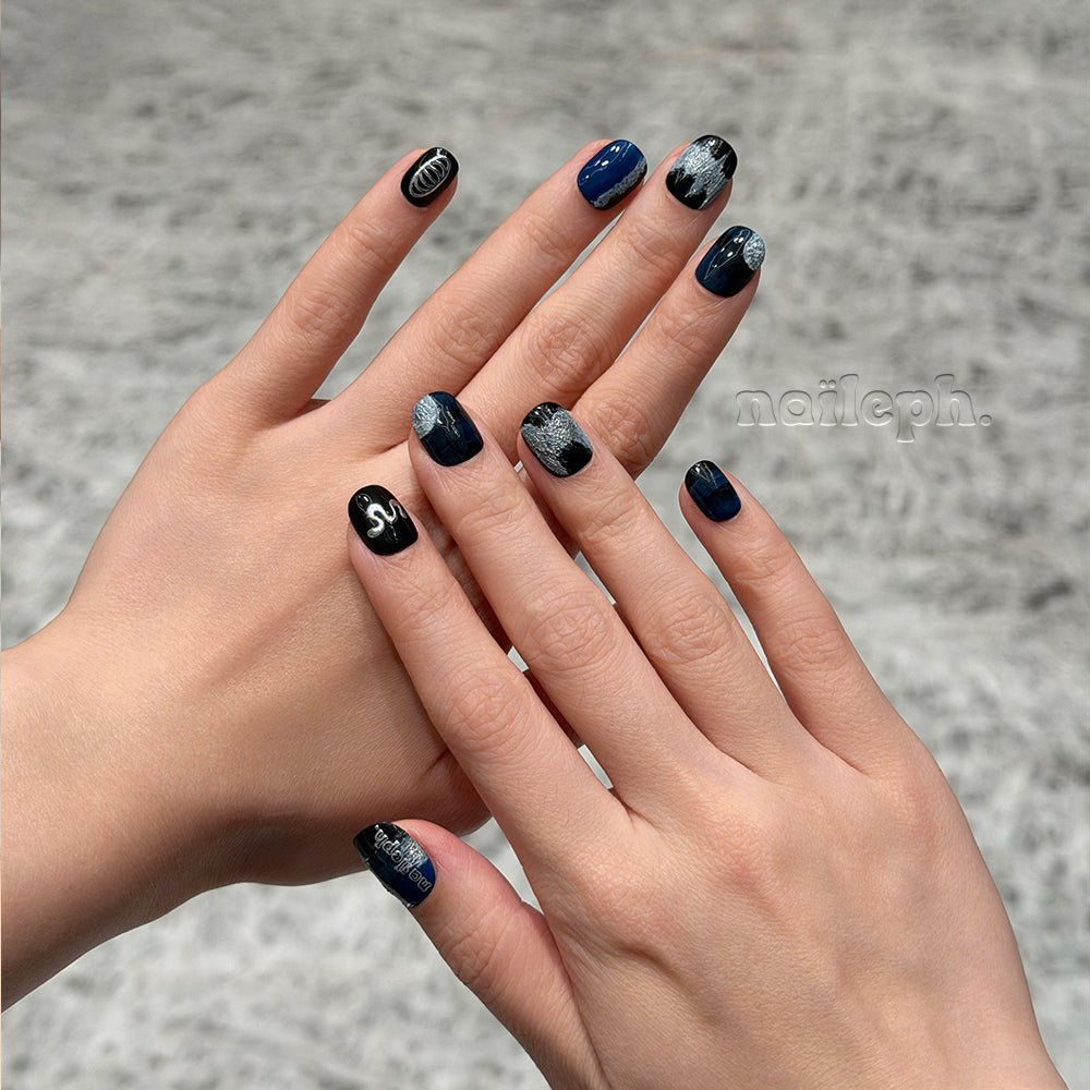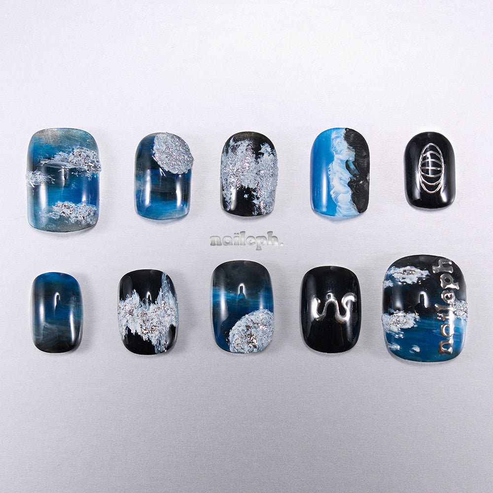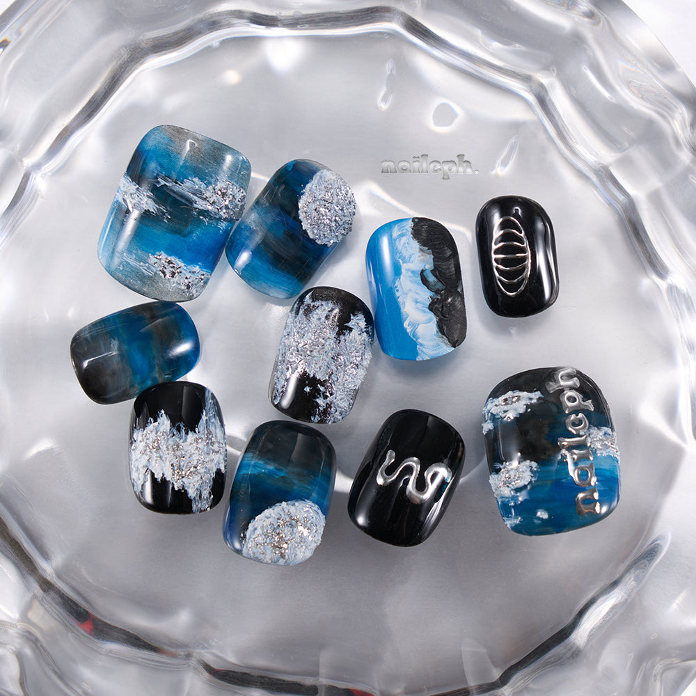 Nebula Frost is a genderless press-on nail set inspired by the endless beauty of the cosmos. Swirling shades of deep space blue, black void, and icy silver create a celestial vibe that feels both dreamy and futuristic. Textured silver accents resemble distant galaxies and frozen nebulae, adding dimension and a tactile edge to each nail.