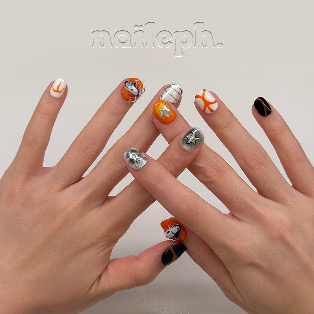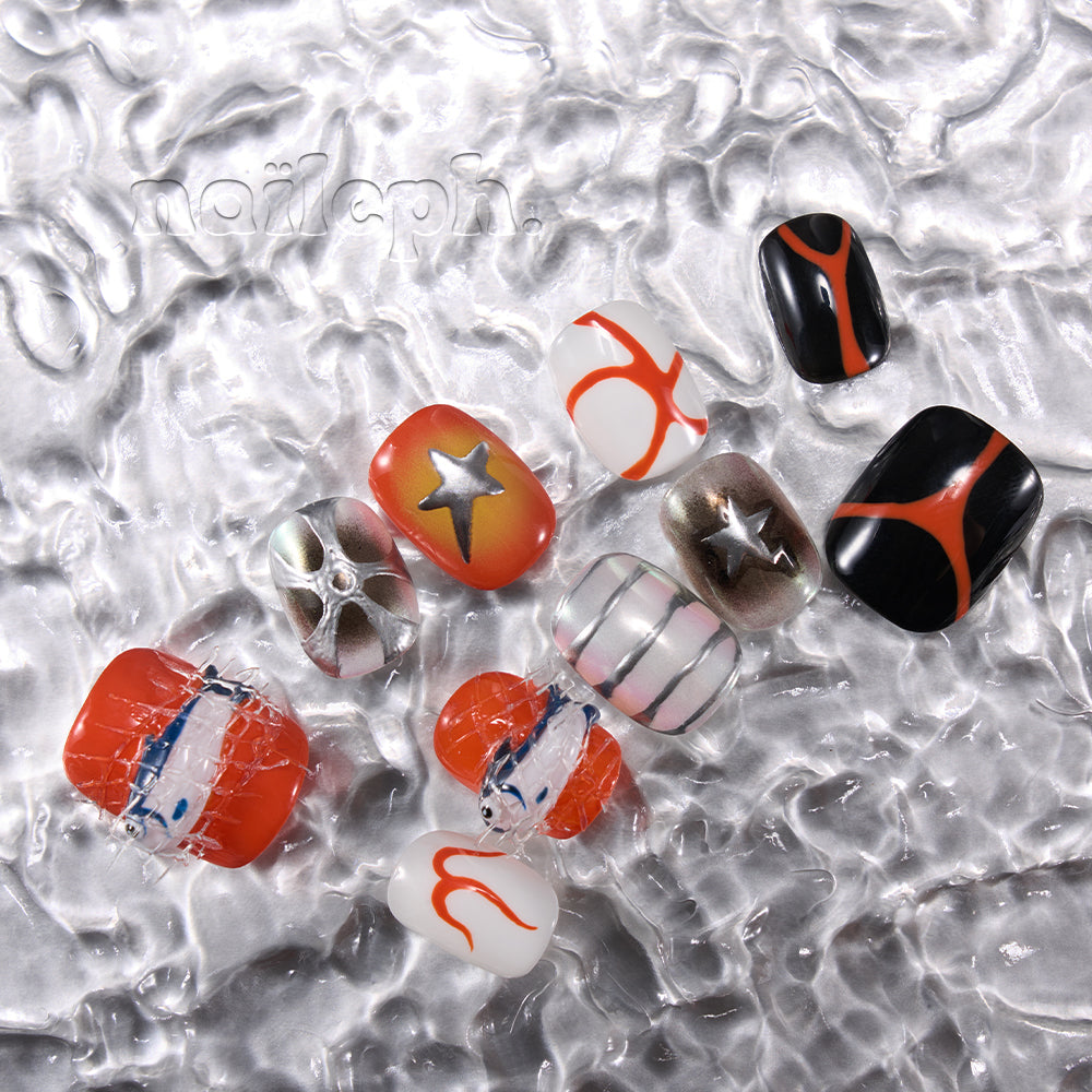 Pop Fever is a playful, genderless press-on nail set inspired by pop art, street style, and quirky creativity. Featuring vibrant orange, metallic silver, classic black, and bright white, each nail comes with unexpected details — 3D mini fish, stars, bold lines, and abstract symbols. The mix of glossy and matte finishes brings texture and contrast, creating a design that feels fun, bold, and completely one-of-a-kind.