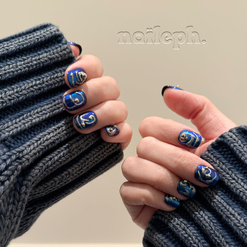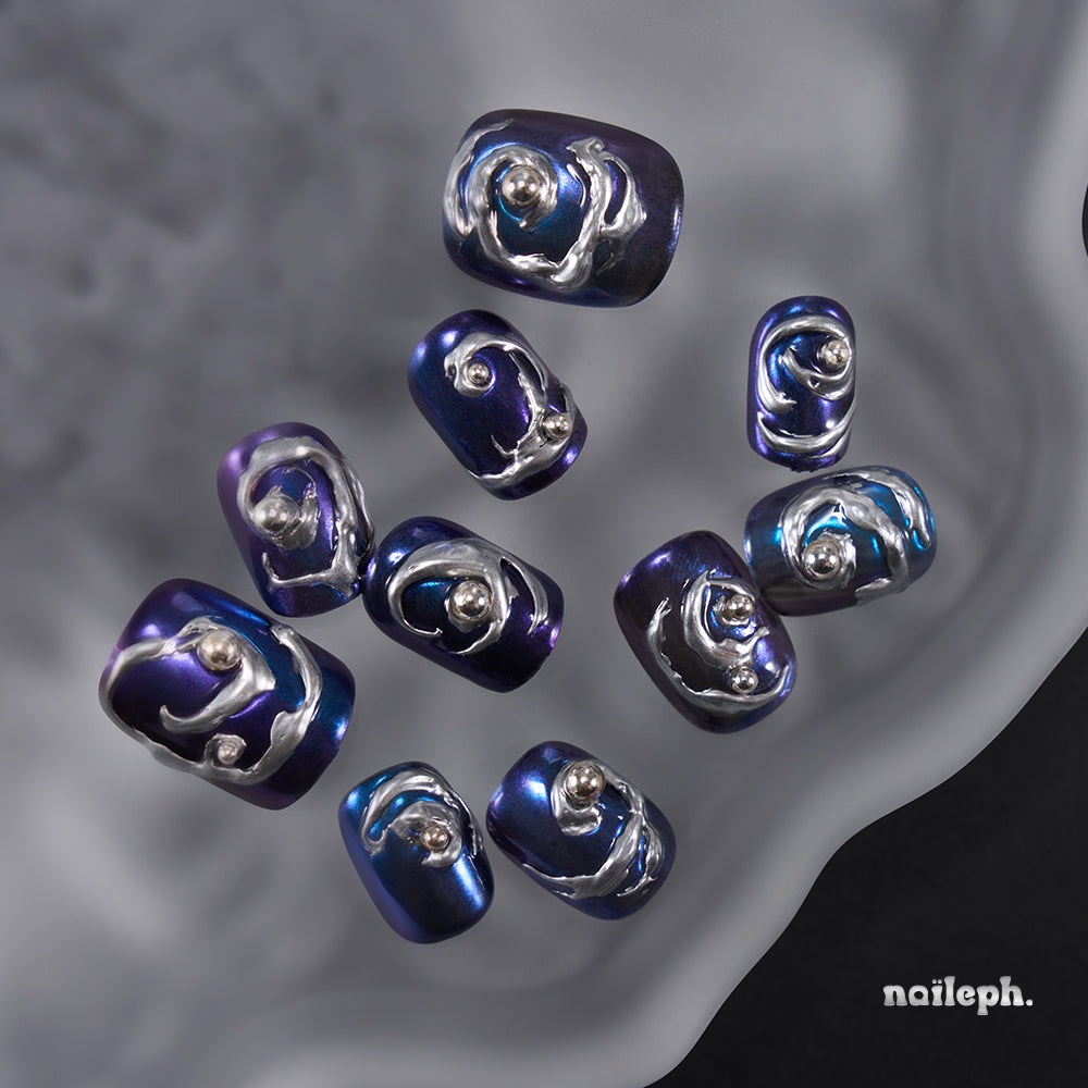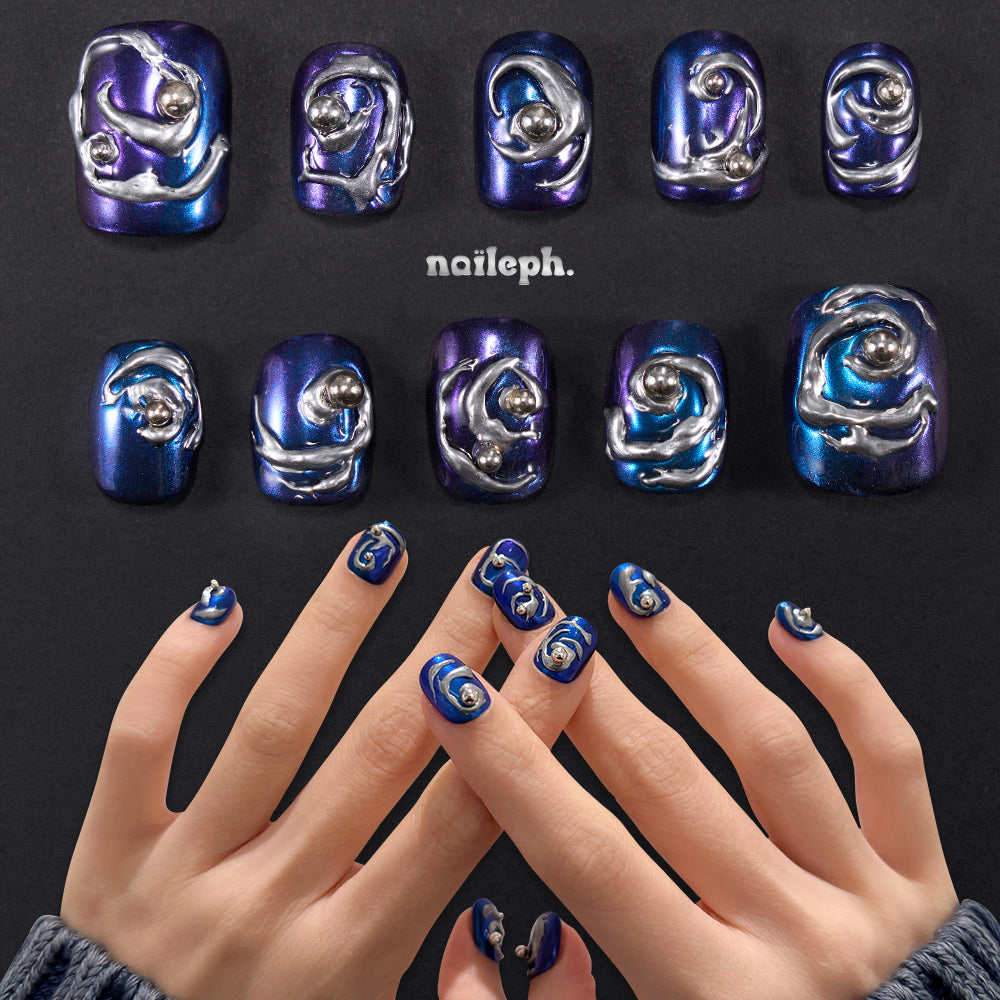 Galactic Drift is a genderless press-on nail set that looks like a piece of the cosmos caught on your fingertips. Featuring a deep gradient of midnight blue to violet with chrome silver swirls and metallic bead accents, this set feels like drifting through galaxies and nebulas. The 3D sculptural designs create the illusion of cosmic waves, giving your nails a bold, otherworldly dimension.