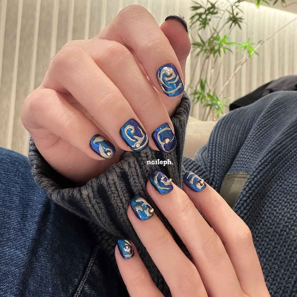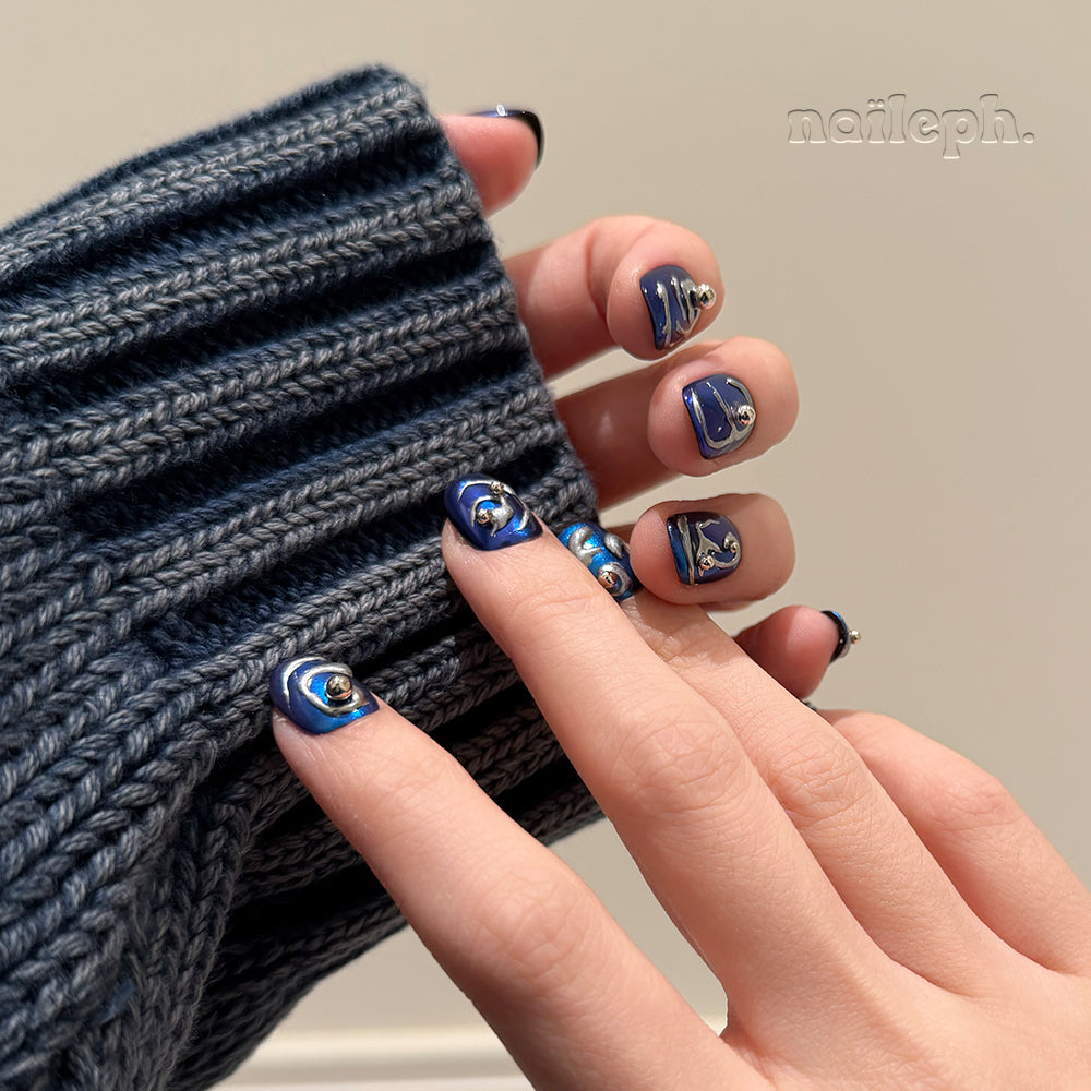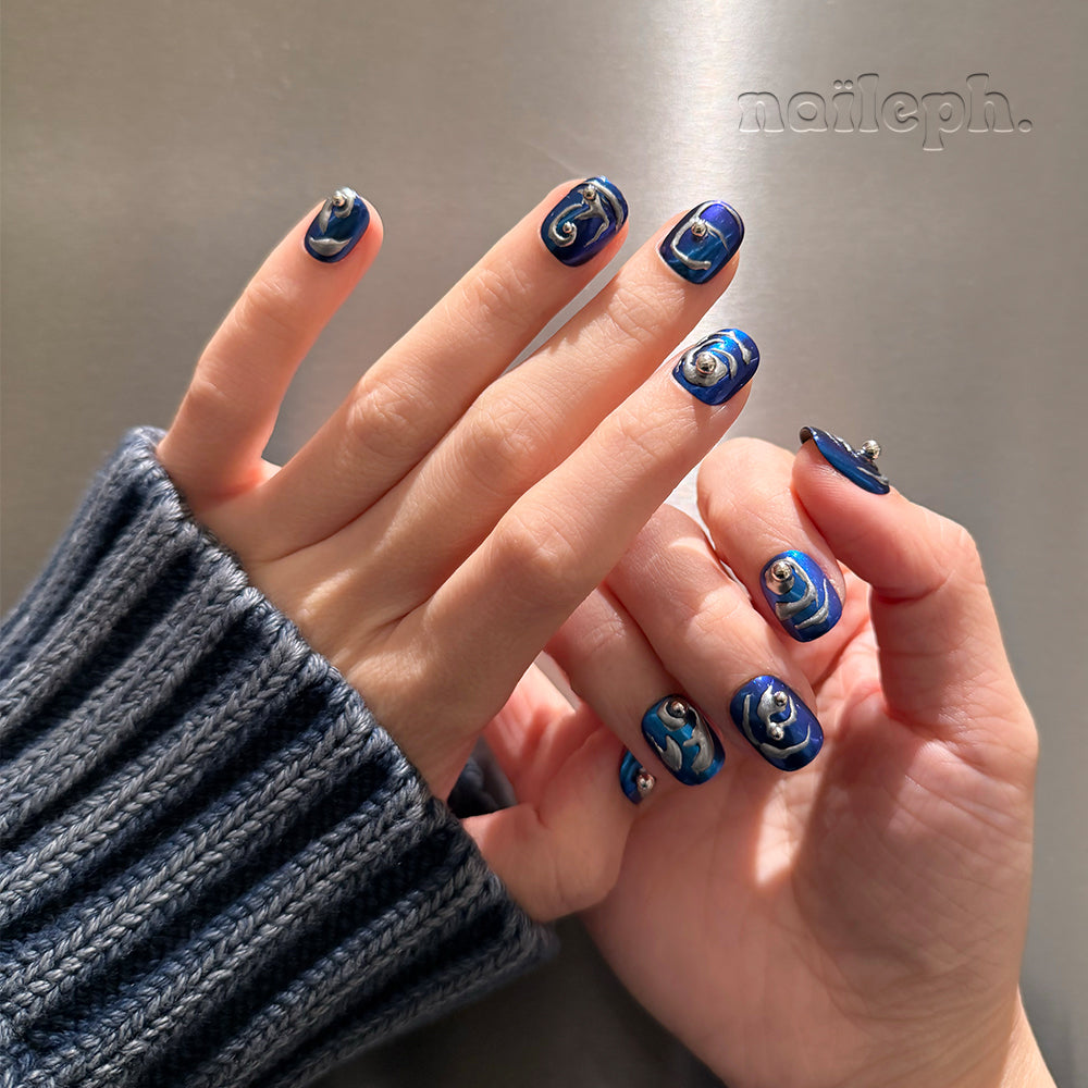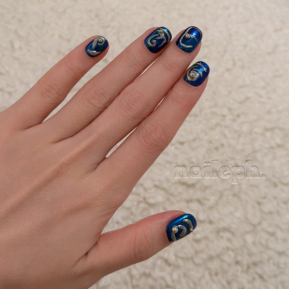 Galactic Drift is a genderless press-on nail set that looks like a piece of the cosmos caught on your fingertips. Featuring a deep gradient of midnight blue to violet with chrome silver swirls and metallic bead accents, this set feels like drifting through galaxies and nebulas. The 3D sculptural designs create the illusion of cosmic waves, giving your nails a bold, otherworldly dimension.