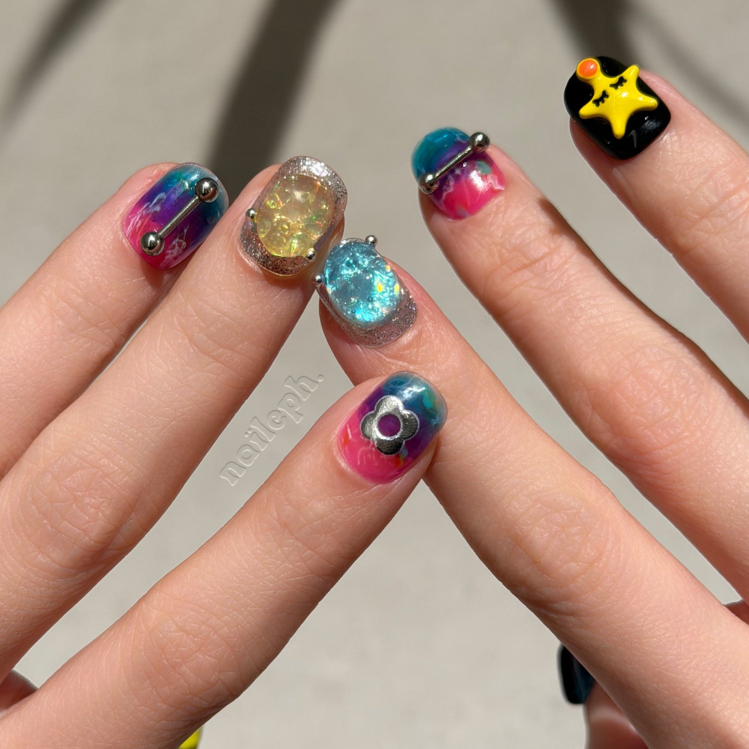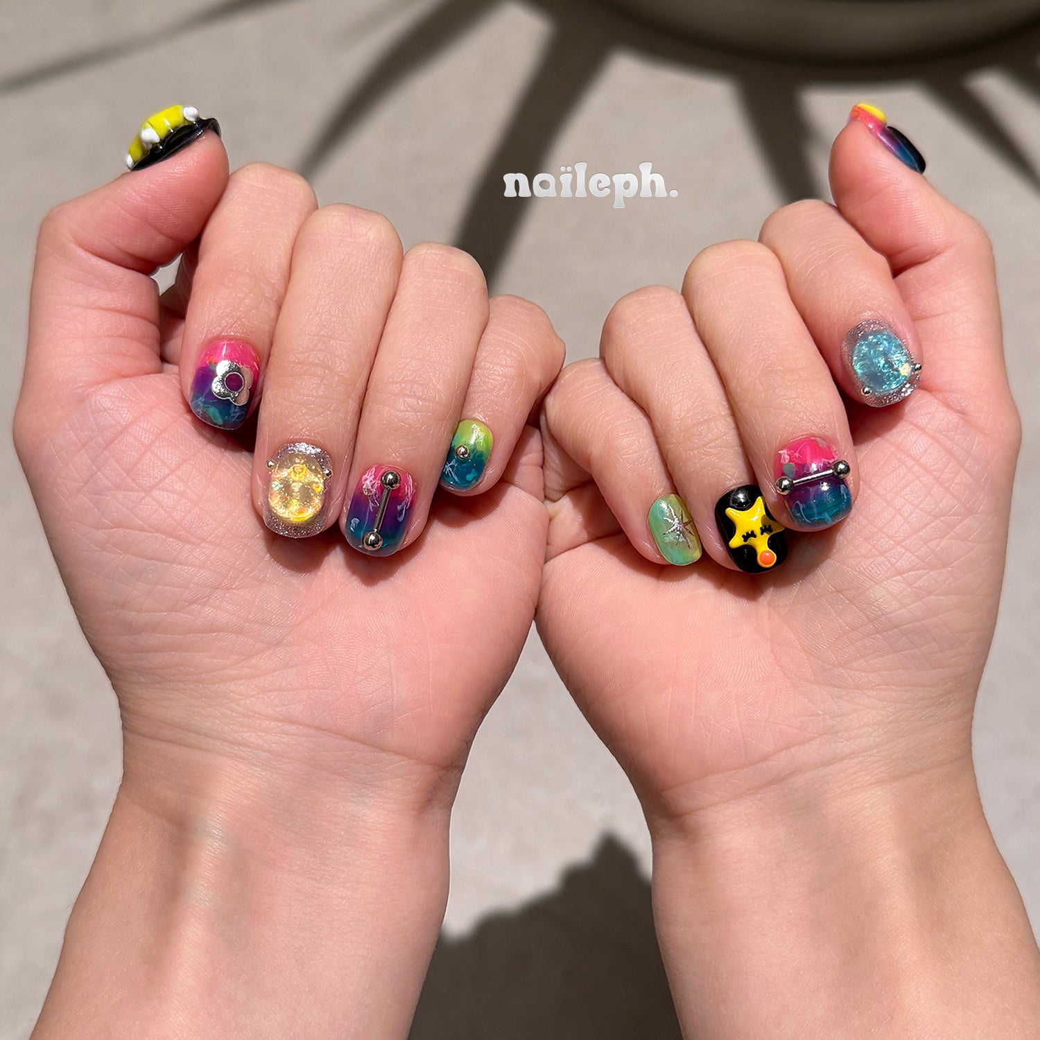 Bring on the color clash with Neo Pop Charms, a vibrant set blending abstract art with playful 3D elements. Each nail bursts with vivid gradients of neon pink, green, yellow, and teal, punctuated with star badges, metal studs, flame designs, and quirky embossed faces.