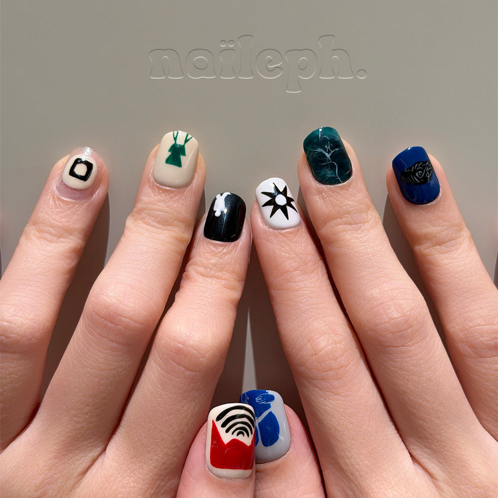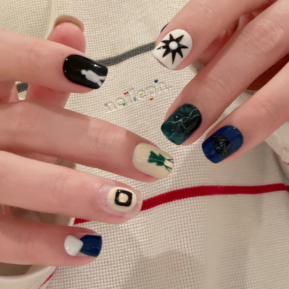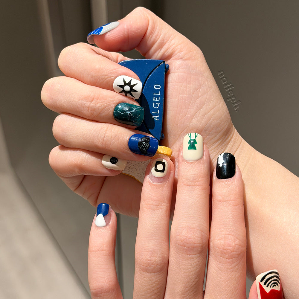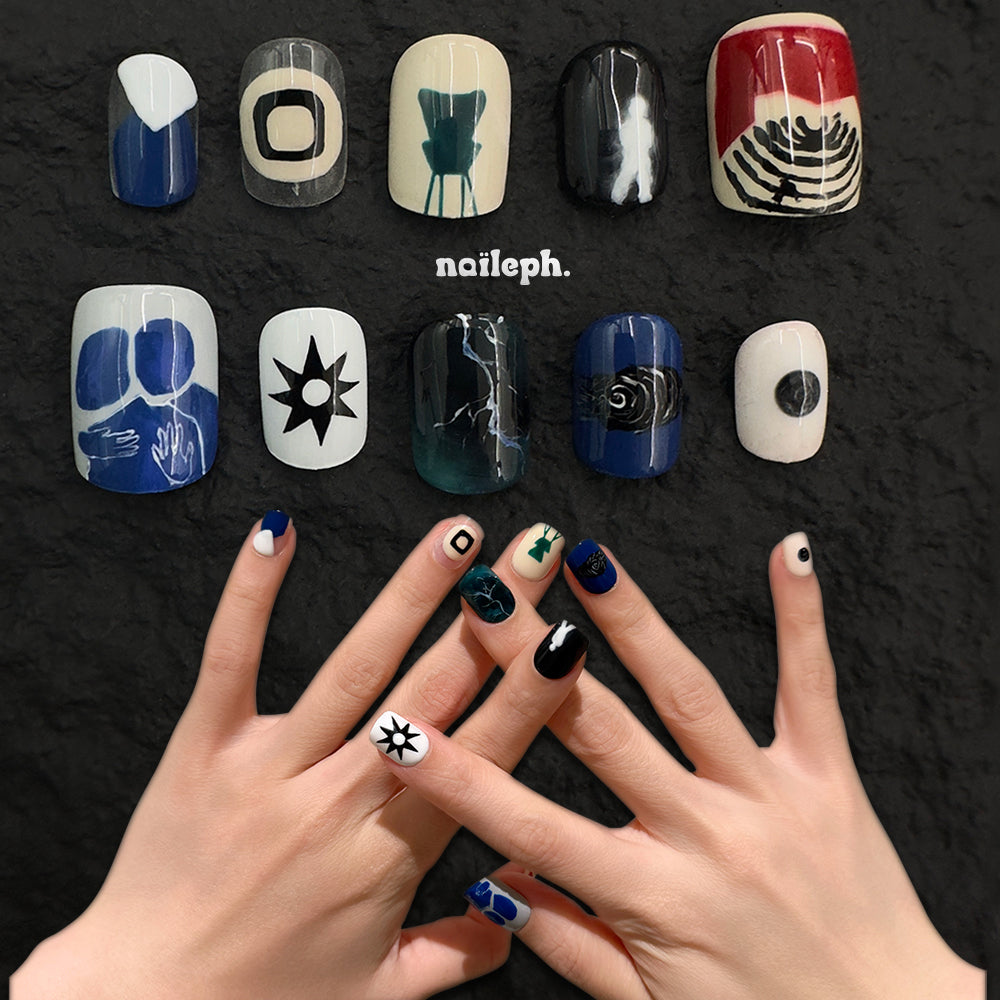 Step into Parallel Dimensions — a genderless press-on nail set that turns your nails into miniature art pieces. Featuring abstract illustrations, cosmic patterns, electric blues, and bold black-and-white contrasts, this collection speaks to every creative soul. Each nail is different yet part of the same story — a visual journey that feels both modern and surreal.