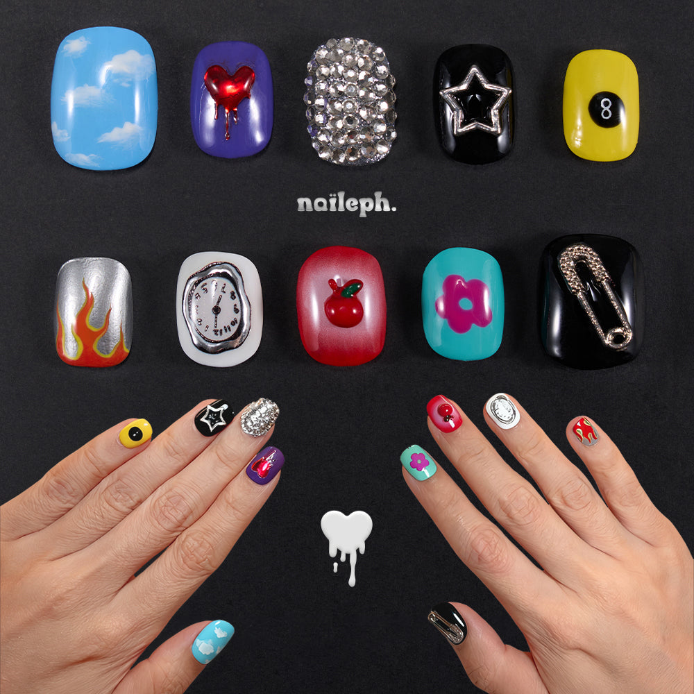 Pop Icons is a playful mashup of iconic pop art and cultural symbols, vividly brought to life across each nail. Featuring dreamy skies, a melting clock, a safety pin, flames, and even a rhinestone-embellished nail — every piece is a statement of fun, nostalgia, and rebellion.