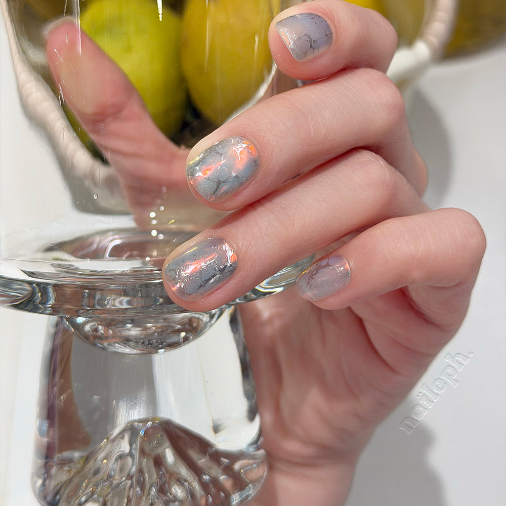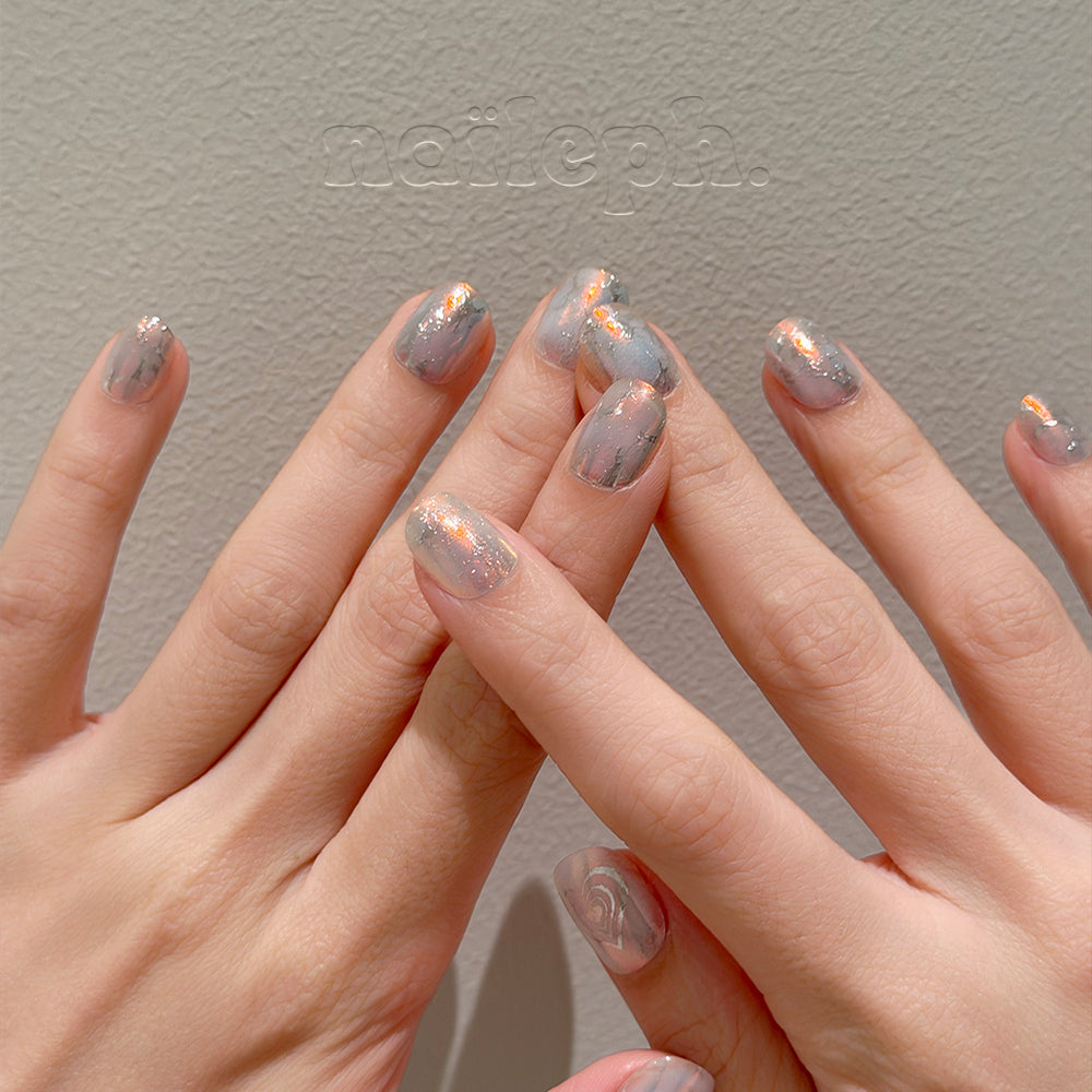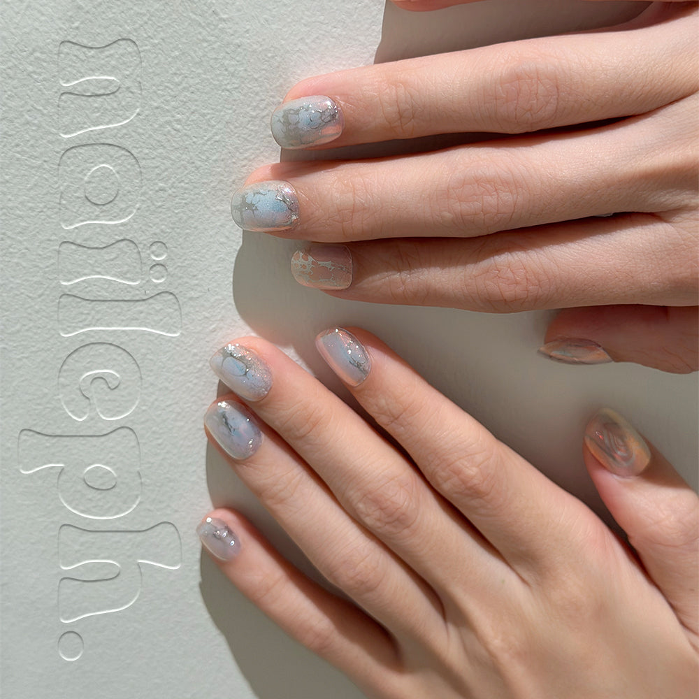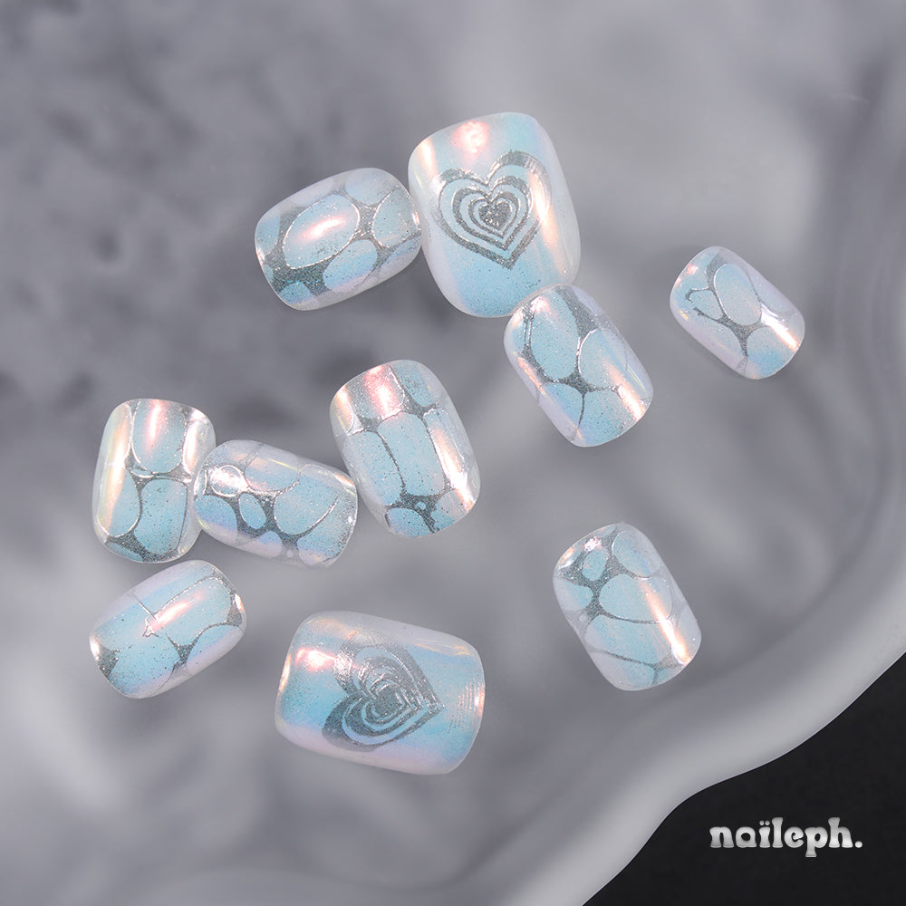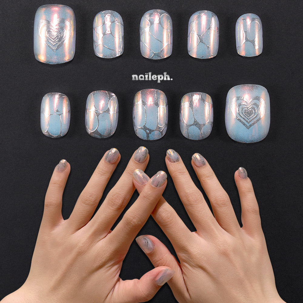Prism Love is a genderless press-on nail set that captures the soft shimmer of light through glass. Designed in dreamy pearl white, soft blue, and a delicate pink sheen, each nail features subtle cracked textures and a reflective glow that shifts with every movement. The heart-shaped detailing adds a quiet charm, making it feel both futuristic and romantic.
