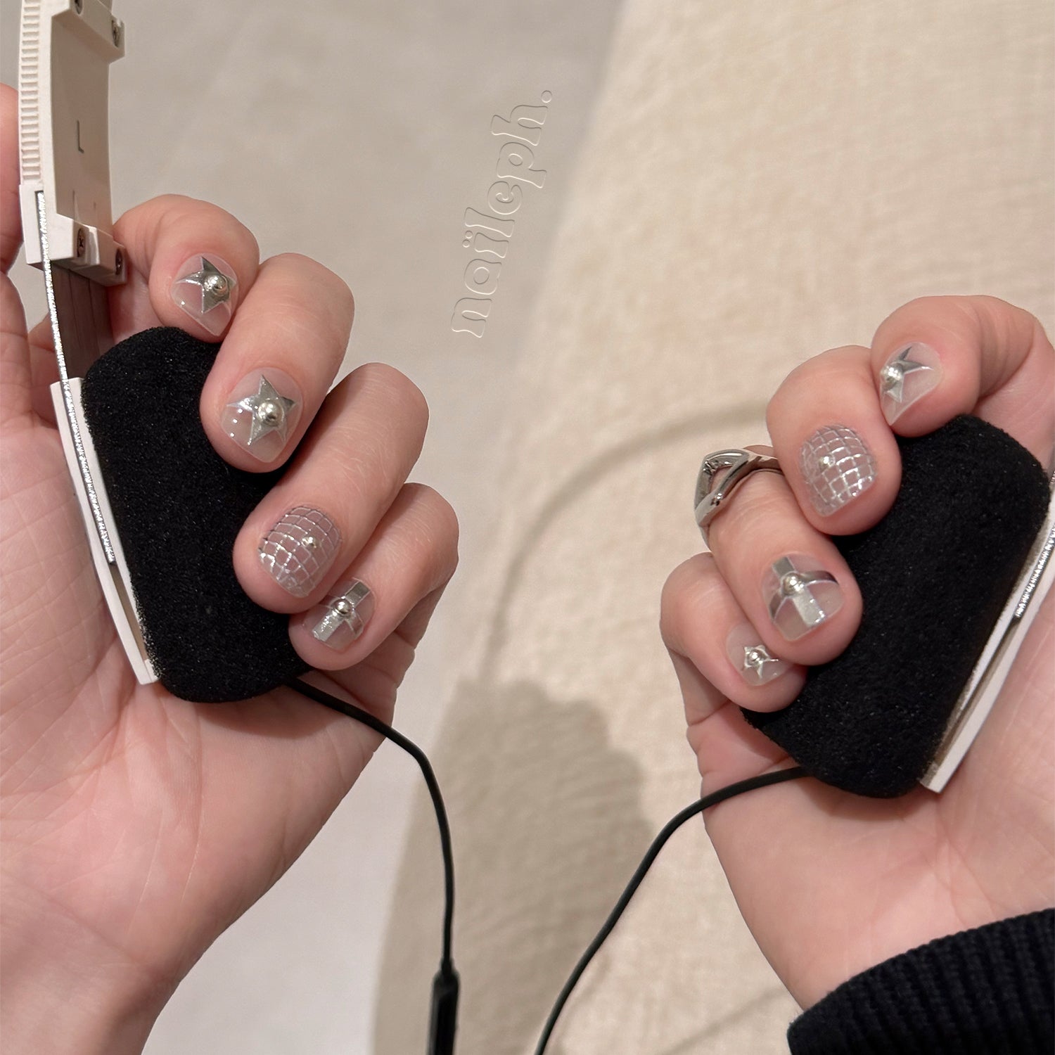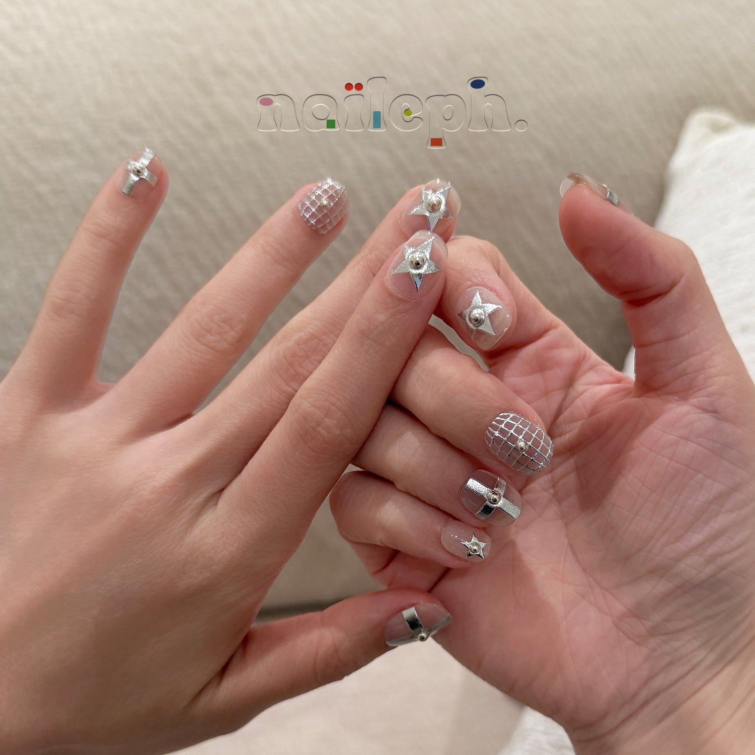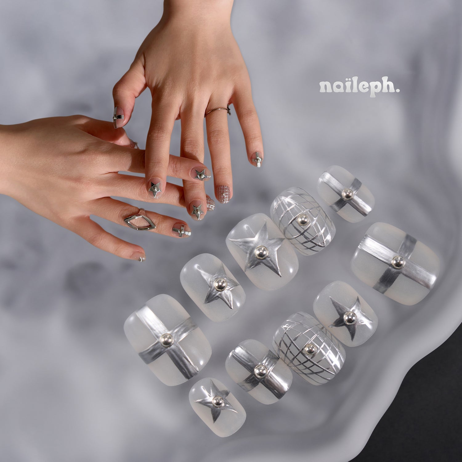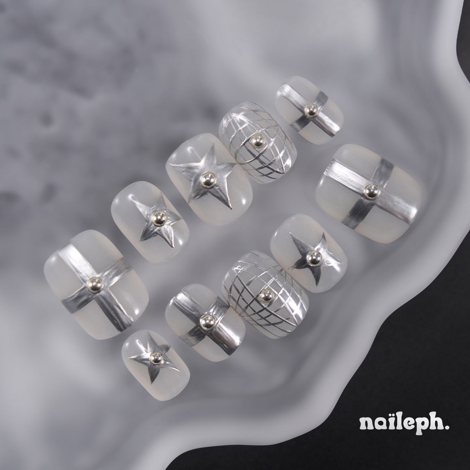 Stellar Grid is a genderless press-on nail set inspired by futuristic architecture and celestial geometry. With a sleek combination of metallic silver lines, 3D star details, and grid-like patterns, this set feels like a portal to a sci-fi universe. The clean, translucent base contrasts beautifully with the sharp silver accents, creating a modern, minimal yet impactful look.