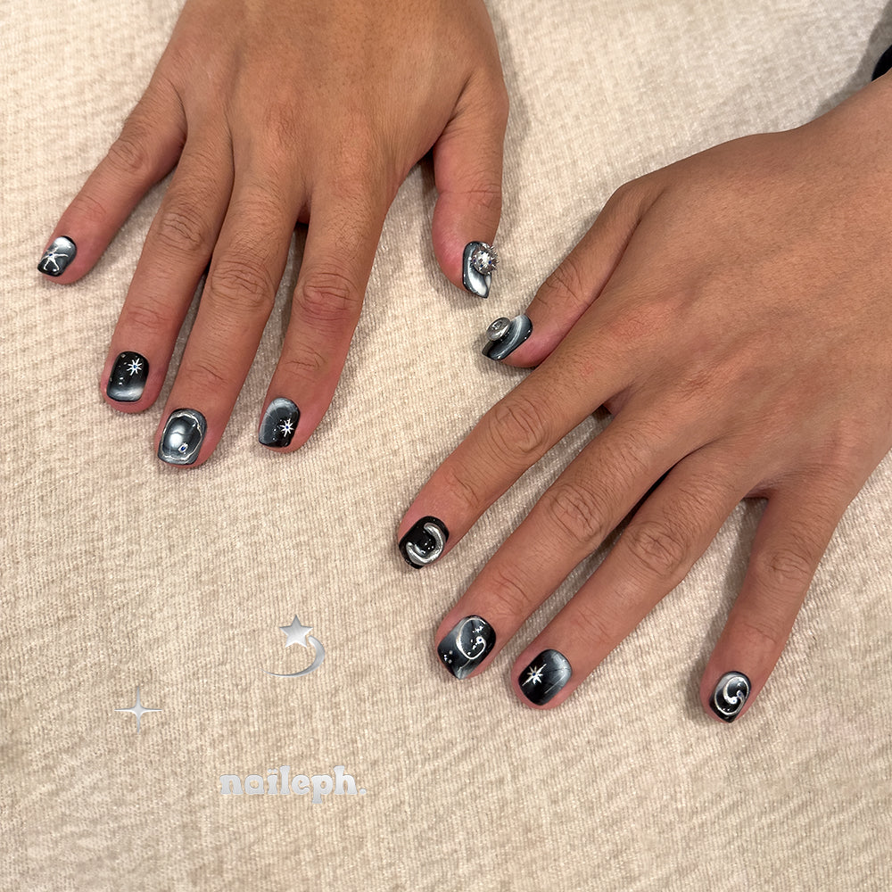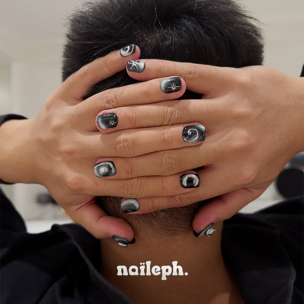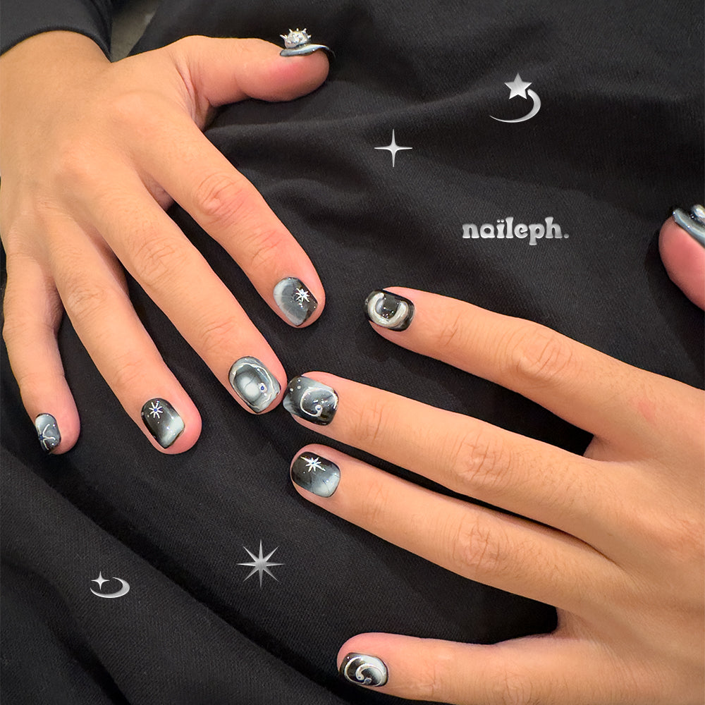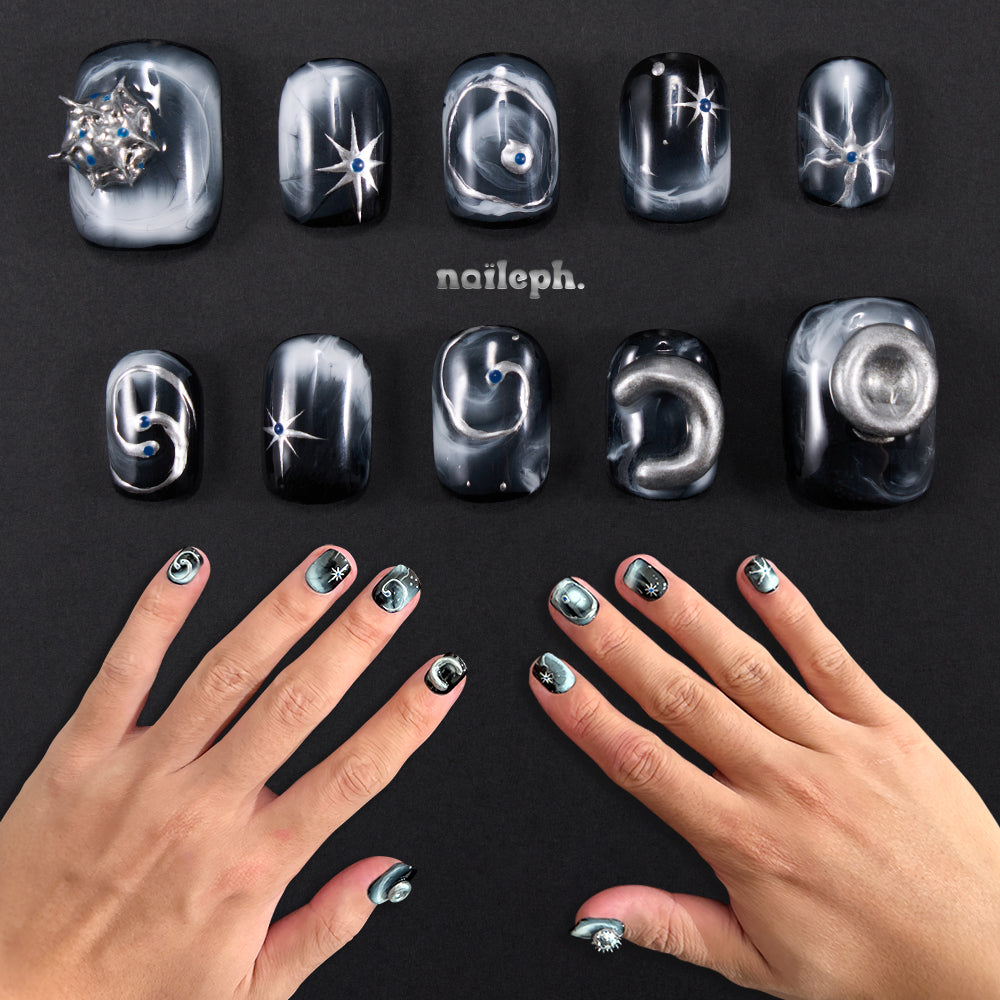 Each nail feels like a portal to deep space — where stars collide, and black holes form. The combination of glossy finishes with sculptural metallic details creates a cosmic elegance perfect for those who want to wear the universe on their hands.