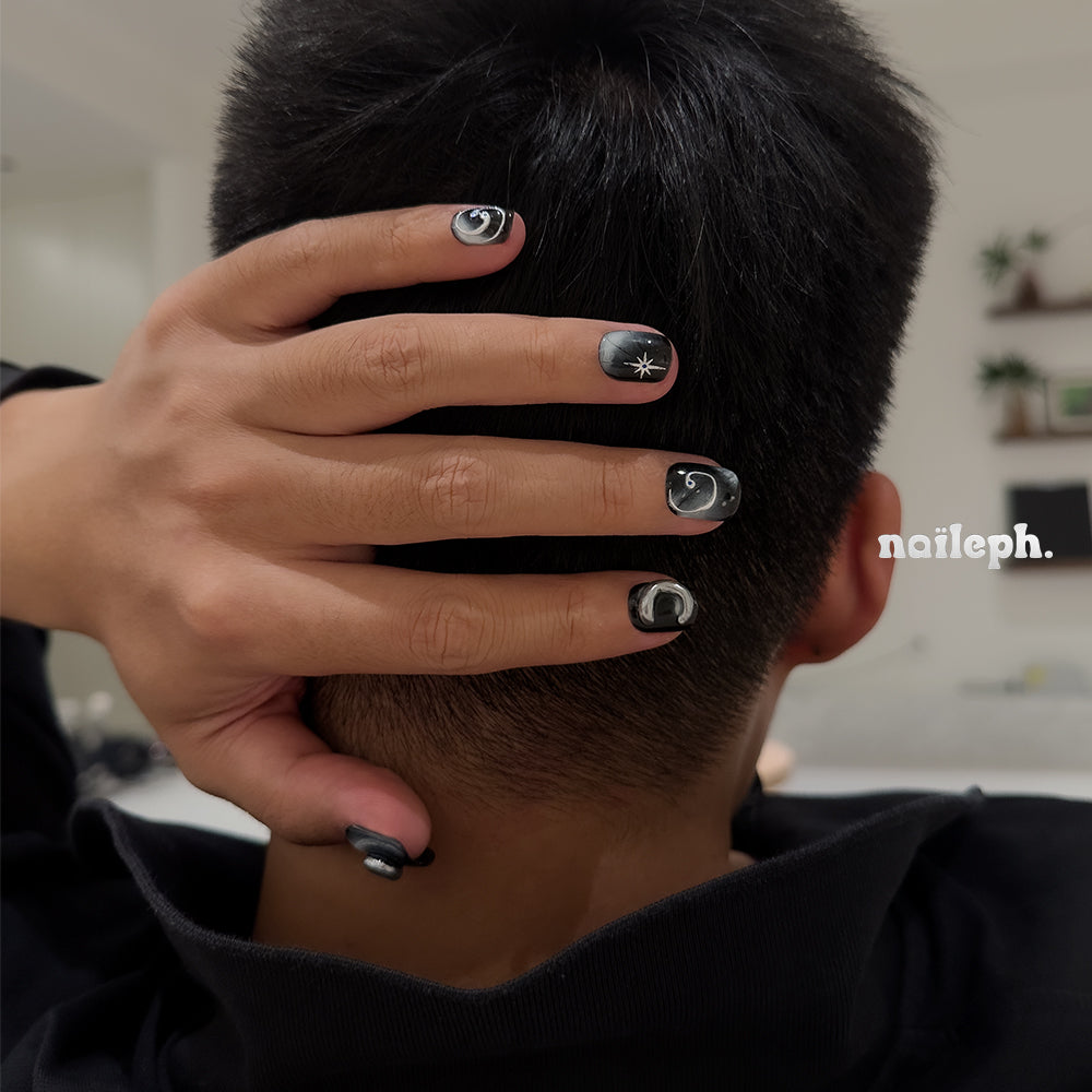 Stellar Void is a genderless press-on nail set that captures the mystery and depth of the galaxy. Painted in smoky black with cloudy white swirls, the design is accented with intricate silver 3D elements, tiny sapphire-like gems, and delicate starbursts that shimmer like distant constellations.